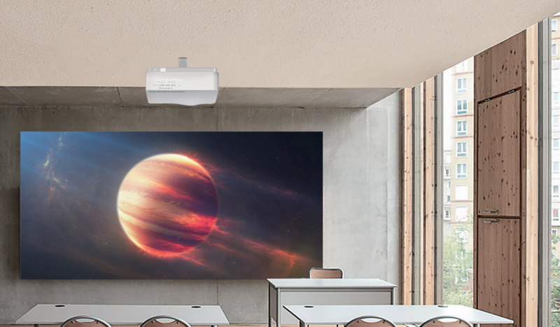 長虹激光電視商教系列為超短焦激光電視,離墻50厘米就能投射100吋畫面,更省空間,也不會因為長焦投影而照射老師或會議演講者的眼睛。