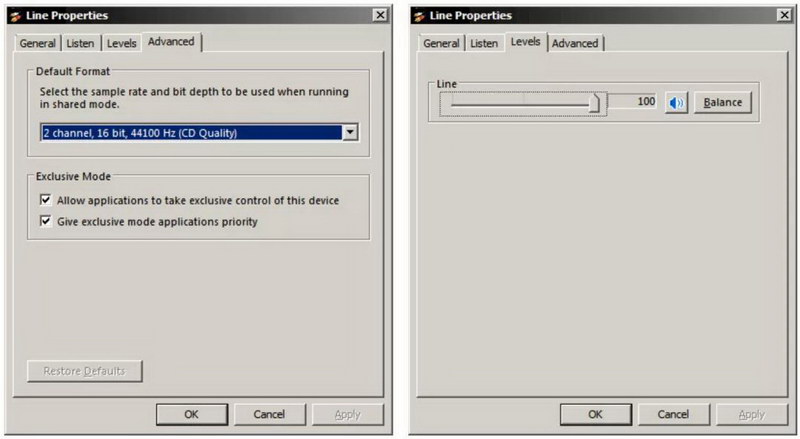 切換到“高級”選項卡,然后選擇“ 2通道,16位,44100 Hz(CD質(zhì)量)”,如下所示(左)。現(xiàn)在單擊“應(yīng)用”。接下來,選擇“級別”選項卡,并確保將級別設(shè)置為最大,如下所示(右),并且不要設(shè)置靜音。DATS在1通道輸入或44.1 kHz以外的采樣頻率下將無法正常運行。