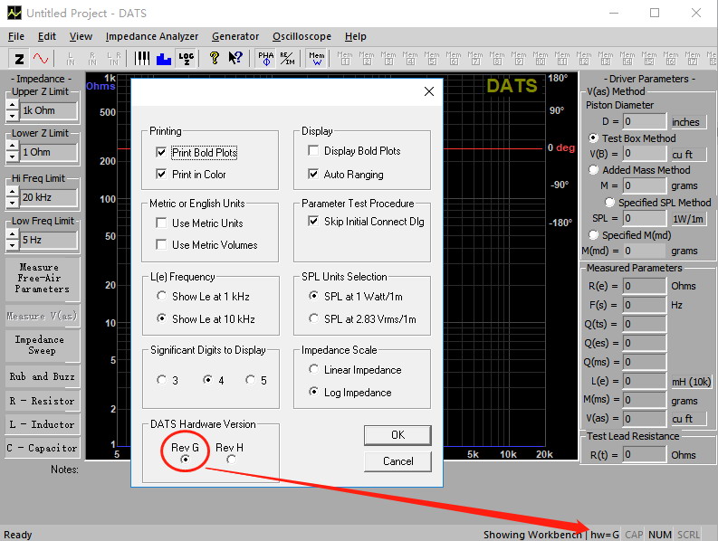 如果您使用的是Rev G硬件,并且使用的是V3.1.0軟件(或更高版本),請打開“Preferences”對話框(在“Edit”菜單下),并在如下所示的“DATS Hardware Version”選項組中更改為“Rev G”: