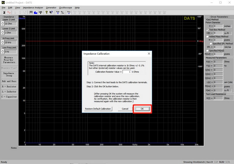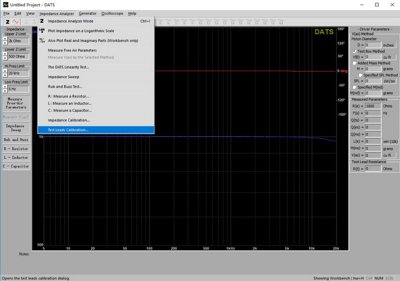 將測試導(dǎo)線連接到DATS V3前面板上的金屬校準(zhǔn)端子上。在“Impedance Calibration…”菜單下選擇“Impedance Analyzer”,并按照說明使用內(nèi)置的±0.1%校準(zhǔn)電阻以1k歐姆校準(zhǔn)系統(tǒng)。軟件將測試參考電阻并繪制結(jié)果。確認(rèn)屏幕右側(cè)的RE字段顯示的值非常接近1000歐姆。如果不是,重復(fù)校準(zhǔn)程序。數(shù)值通常在995到1005歐姆之間。
