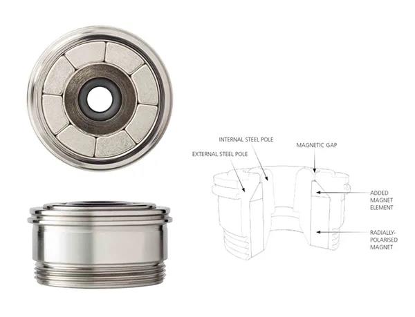 單元后方也有學(xué)問。他們的磁鐵稱為Super Flux Magnet,Vivid高音單元的磁鐵必須配合導(dǎo)管形狀,不能太大,這樣也才能更拉近和中音單元的距離。因此他們的磁鐵磁力特強(qiáng),高達(dá)2.5特斯拉。高磁力的磁鐵,有助于提高Vivid音箱的單元效率,例如G1上所使用的高音單元,效率就高達(dá)97dB,更利于再生細(xì)節(jié)。音圈繞線采包銅鋁線,取其質(zhì)量輕的特點(diǎn)。而音圈與磁鐵間的距離,也就是所謂的磁隙越小越好,這樣才有更高的磁通量帶動音圈?墒,當(dāng)音圈運(yùn)動時(shí),會擠壓到磁隙內(nèi)那極少的空氣,這會阻礙音圈的運(yùn)動。Vivid的解法是在音圈套筒上挖出孔洞,這稱為Highly Vented Former (HVF) 。