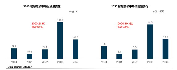 相比之下,智慧黑板同樣呈現(xiàn)出激增態(tài)勢。2020年智慧黑板在義務(wù)教育中快速替代教育平板,2020年總出貨量213K,同比增長87%;全年銷售額39.3億元,同比增長41%,迎來爆發(fā)式增長。