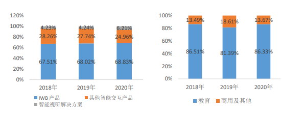按產(chǎn)品劃分,2020年IWB產(chǎn)品、其他智能交互產(chǎn)品、智能視聽解決方案占營收構(gòu)成比例分別為68.83%、24.96%、6.21%,分別實(shí)現(xiàn)營業(yè)收入27.49億元、9.97億元、2.48億元。
