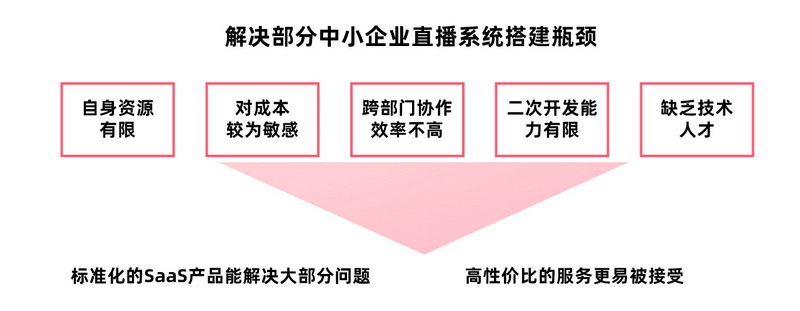 對(duì)于資源競(jìng)爭(zhēng)力不足、抗風(fēng)險(xiǎn)能力較差且數(shù)字化能力不足的中小企業(yè),高性價(jià)比,高標(biāo)準(zhǔn)化,SaaS直播服務(wù)是首選。
