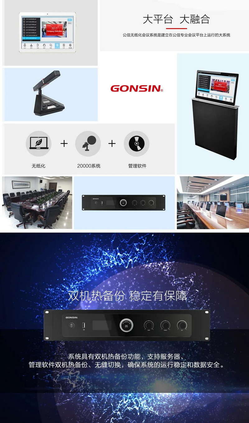 作為行業(yè)領先的會議系統(tǒng)整體解決方案提供商,GONSIN公信產(chǎn)品涵蓋表決、討論、同聲傳譯、報到、中央控制、會議擴聲、遠程視頻會議及會議管理平臺軟件及教學系統(tǒng)九大產(chǎn)品系列。