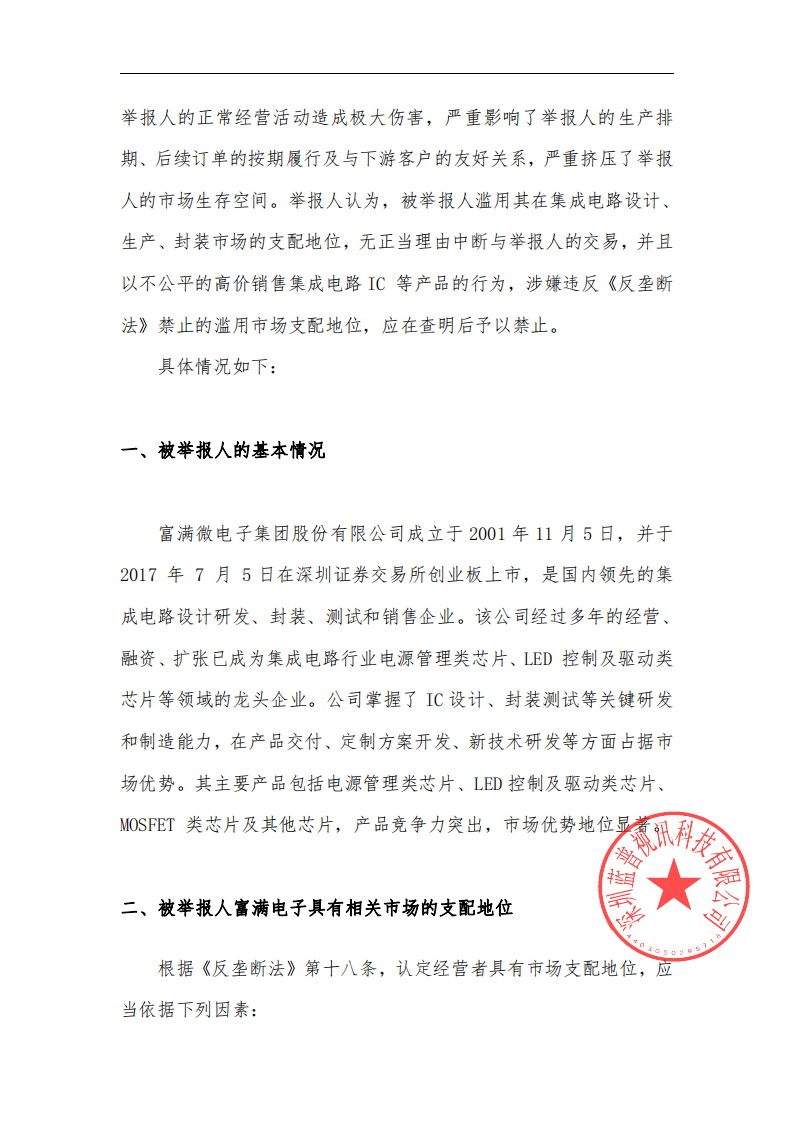 在積極準(zhǔn)備聯(lián)合訴訟材料的同時(shí)藍(lán)普視訊已經(jīng)向中國(guó)光學(xué)光電子行業(yè)協(xié)會(huì)和國(guó)家市場(chǎng)監(jiān)督管理總局反壟斷局提交了《關(guān)于富滿(mǎn)電子涉嫌濫用市場(chǎng)支配地位壟斷相關(guān)芯片市場(chǎng)的舉報(bào)信》。