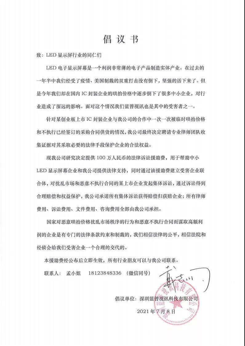 藍(lán)普視訊在7月8日向LED行業(yè)發(fā)出提供100萬(wàn)人民幣法律援助向某創(chuàng)業(yè)板IC上市企業(yè)進(jìn)行聯(lián)合訴訟的倡議書(shū)后,截止目前已經(jīng)收到了行業(yè)近100家IC受害企業(yè)的聲援、9家顯示屏幕企業(yè)請(qǐng)求參與聯(lián)合訴訟。