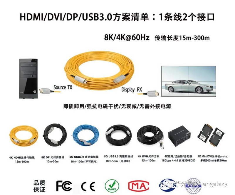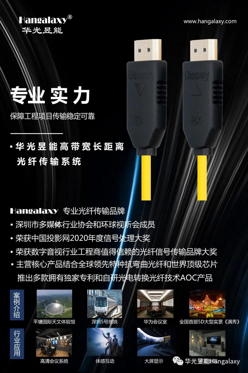 自2014年開始,華光昱能Hangalaxy品牌就在中國音視頻行業(yè)推廣運用4K 15米至300米HDMI光纖線、8K 10米至300米DP光纖線,USB3.0 10米至100米光纖線等產(chǎn)品。