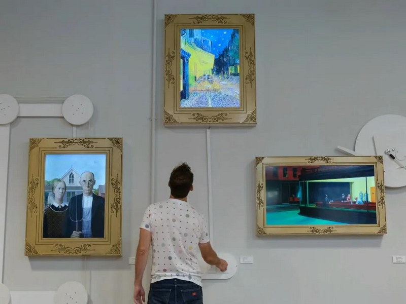 參與者通過拉動繩索裝置,將原畫作的場景變成了夜晚的樣子,同時,也為畫作里嚴(yán)肅的兩位農(nóng)民更換著裝,頓時化身成為了艷麗的“時尚達(dá)人”。