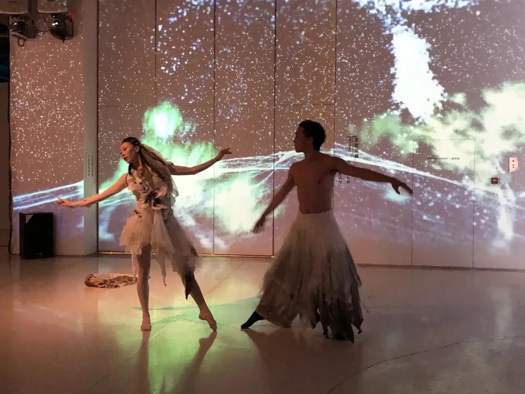 演出過(guò)程中設(shè)置了大量的引導(dǎo)性互動(dòng),通過(guò)高度儀式化的藝術(shù)性肢體動(dòng)作,精心設(shè)計(jì)的環(huán)節(jié),象征寫(xiě)意化的數(shù)字視覺(jué)背景,突破現(xiàn)實(shí)時(shí)空的局限和慣性思維的束縛,打破具象化的窠臼。