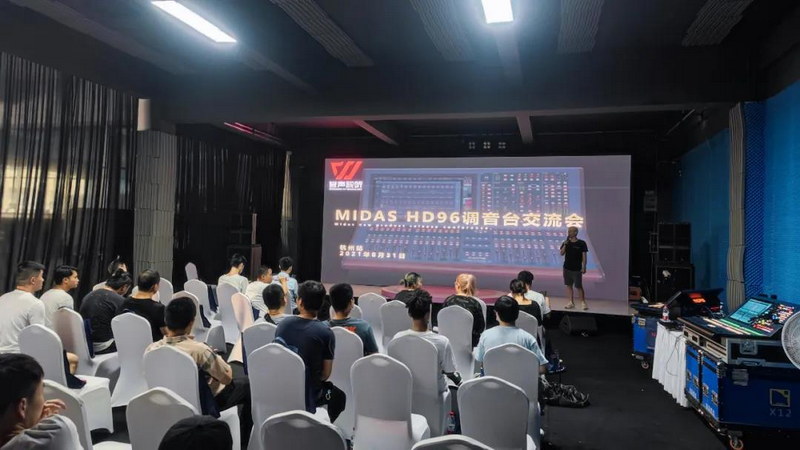 在交流會(huì)上,由譽(yù)聲視聽的產(chǎn)品經(jīng)理韋周成先生上臺(tái)為大家著重介紹HD96-24。首先,他從MIDAS的品牌發(fā)展歷程開始講起,還會(huì)介紹經(jīng)典且備受關(guān)注的調(diào)音臺(tái),讓大家對(duì)于這個(gè)品牌有一個(gè)基本的了解。緊接著,他會(huì)跟大家分享MIDAS近些年的經(jīng)典案例,如央視春晚井岡山分會(huì)場、寧波文化廣場大劇院等等。
