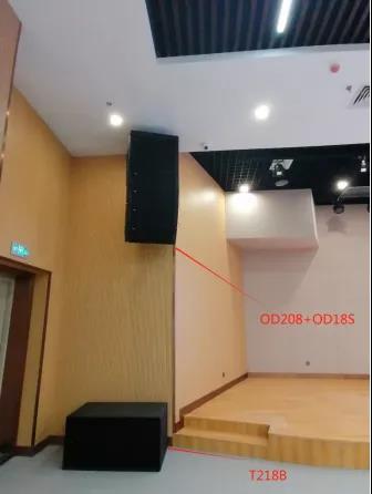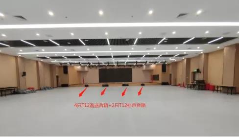 舞臺返送音箱采用了4只T12全頻音箱作為發(fā)言者/表演者的監(jiān)聽,為其提供悅耳的音質(zhì)效果,并對主舞臺表演區(qū)域進行聲場覆蓋,以滿足不同場合的聲音需求。此外,因吊頂下總層高只有4.2米,且舞臺高度只有30cm,所以在舞臺前方與返聽音箱并排緊挨著落地安裝2只T12全頻音箱,來作為禮堂的補聲音箱,用于觀眾席前排補聲。
