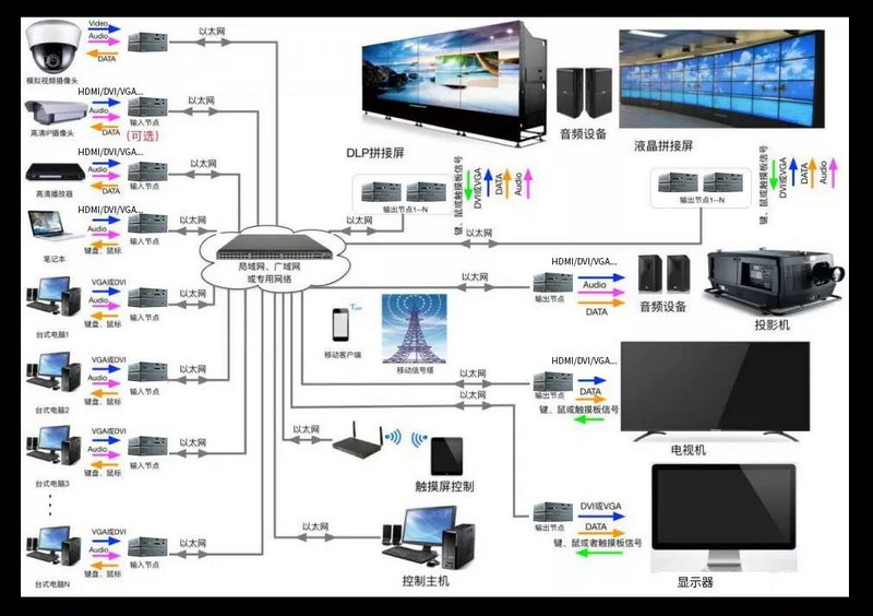 實(shí)現(xiàn)每個(gè)會(huì)議室或包廂中各視頻信號(hào)輸入源到電視機(jī)、投影儀、LED大屏以及電腦顯示器等顯示端進(jìn)行顯示。同時(shí)保證例如點(diǎn)歌機(jī)、DVD、視頻會(huì)議終端等音頻信號(hào) 的同步傳輸。其中還有跨會(huì)議室、跨樓層等遠(yuǎn)距離上的音視頻同步傳輸。涉及到的視頻輸入信號(hào)有傳統(tǒng)的VGA(720P),DVI(1080P,2K)HDMI(1080P,2K,4K)等模擬、數(shù)字、標(biāo)清、高清、超高清信號(hào)的混入。顯示端存在小間距LED大屏(4K),電視機(jī)(1080P,2K),電腦顯示器(720P),商教投影儀(720P,1080P),激光投影(4K)等不同分辨率的顯示特征。