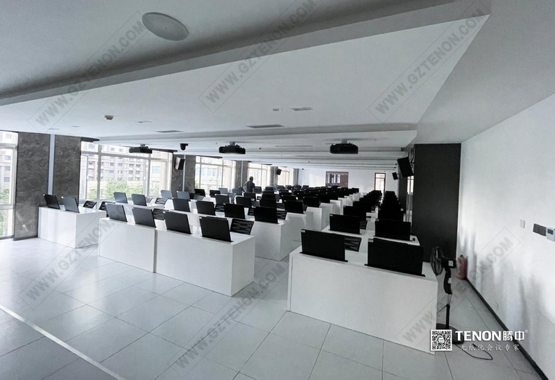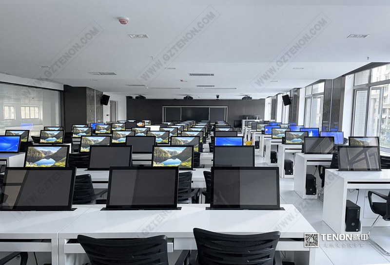 本次項目設計方案將常規(guī)的臺式電腦改用為可升降隱藏的顯示器以及電腦主機,這樣在培訓結束后可以將顯示器統(tǒng)一降下至桌子下,既美觀節(jié)省空間又可以防塵、保護顯示屏。