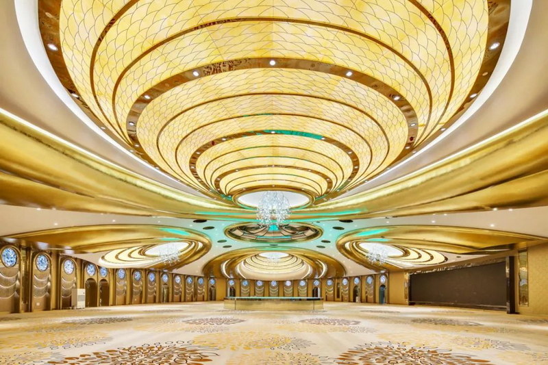 酒店宴會廳大堂的設(shè)計(jì)追求整體統(tǒng)一,以弧形線條來構(gòu)造這個空間,設(shè)計(jì)師別出心裁的使用現(xiàn)代簡潔的設(shè)計(jì)手法來體現(xiàn)豪華的空間感受。而圓形宴會廳的平面則呈現(xiàn)一個橢圓形,寓意圓滿。整個宴會廳面積1700平米,能容納1200人的豪華宴會,墻面采用陣列的設(shè)計(jì)手法,使整體空間和諧統(tǒng)一。瑪瑙石的運(yùn)用彰顯了墻面空間的豪華感,天花設(shè)計(jì)的靈感源于欲振翅高飛的蝴蝶,整體表現(xiàn)效果美輪美奐。