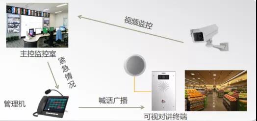 可利用管理機(jī)或系統(tǒng)軟件進(jìn)行實(shí)時監(jiān)聽、監(jiān)視無人化商店各個連鎖店的現(xiàn)場情況,當(dāng)發(fā)現(xiàn)惡意破壞情況,可通過管理機(jī)主動發(fā)起廣播喊話,威懾不法分子。如發(fā)生緊急情況,顧客可隨時通過店內(nèi)對講系統(tǒng)緊急呼叫管理中心,獲得幫助。
