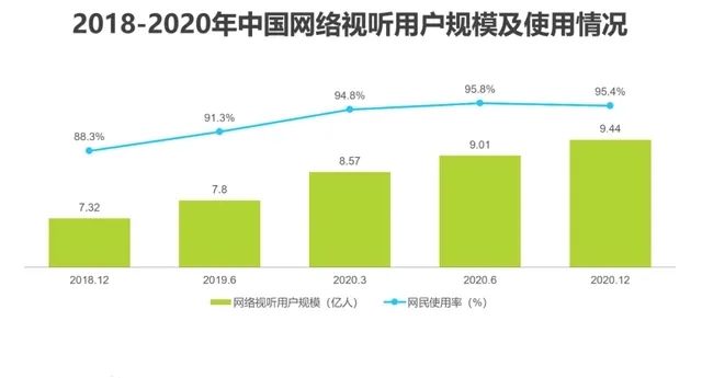 截至2020年底,中國(guó)網(wǎng)絡(luò)視聽(tīng)用戶(hù)占整體網(wǎng)民規(guī)模的比例已高達(dá)95.4%。