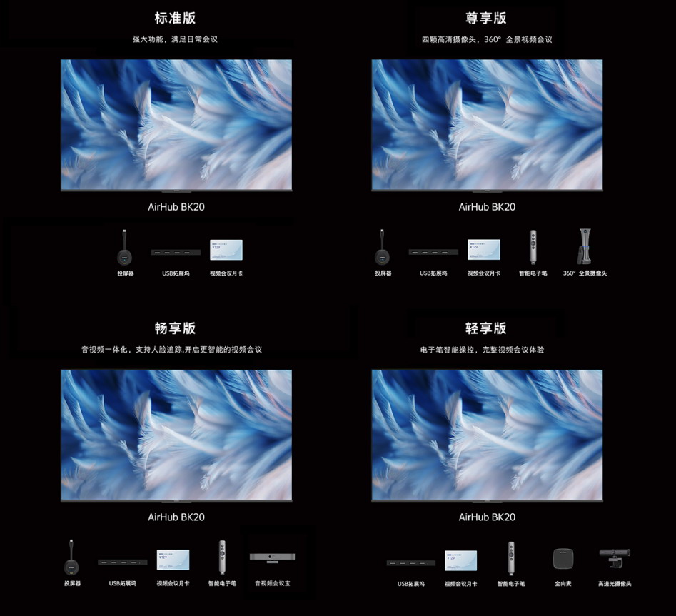 創(chuàng)維商用基于會議場景的不同,為AirHub BK20搭配多種配件組合,推出標準版、輕享版、暢享版、尊享版這四大套餐版本,滿足多元需求。