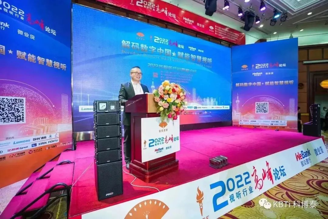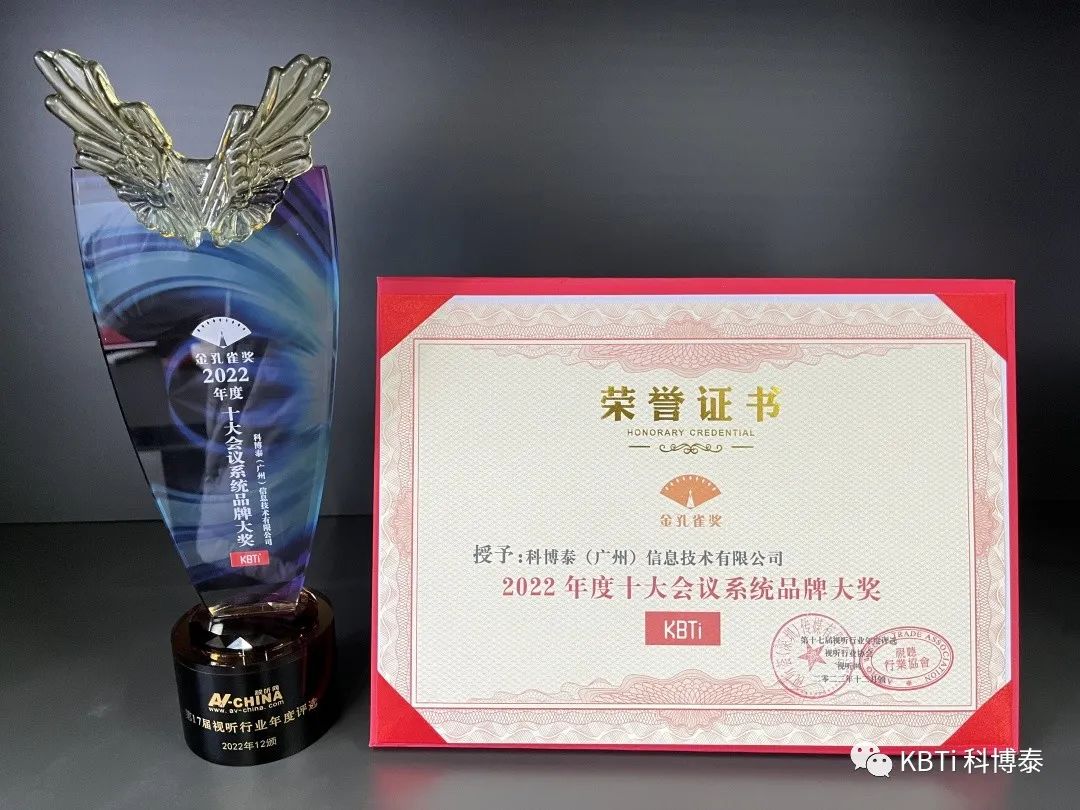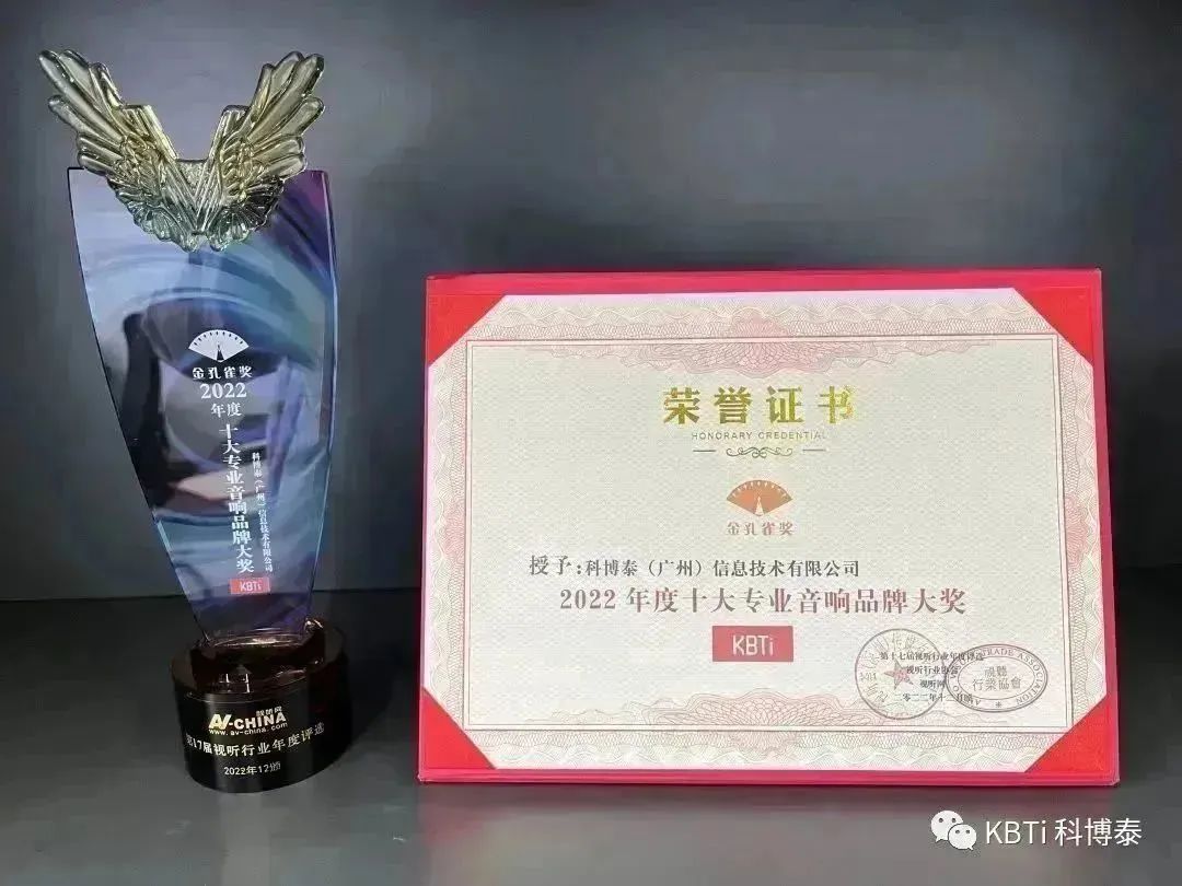 我司非常榮幸的能夠參與此次的頒獎典禮大會,在本屆頒獎典禮上,科博泰受到主辦方和業(yè)內(nèi)同行的認(rèn)可,榮獲兩個2022年度金孔雀獎杯和相關(guān)的榮譽(yù)證書,分別是“2022年度十大專業(yè)音響品牌大獎“和”2022年度十大會議系統(tǒng)品牌大獎“