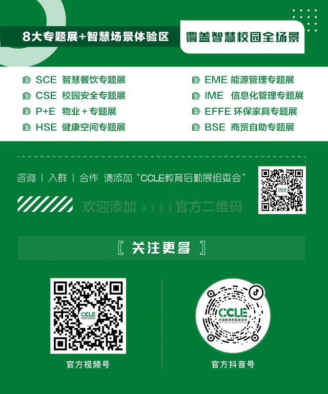 CCLE中國(guó)教育后勤展覽會(huì),簡(jiǎn)稱“CCLE教育后勤展”。展會(huì)聚焦校園后勤管理服務(wù),通過(guò)展示校園安全、智慧餐飲、能源管理、環(huán)保家具、校園信息化等多個(gè)方面展品,以及組織開(kāi)展全國(guó)學(xué)校教育后勤領(lǐng)域論壇會(huì)議等多方面服務(wù),打造集展覽展示、學(xué)習(xí)交流、供需鏈接、貿(mào)易合作等功能于一體的校園綜合服務(wù)平臺(tái),引領(lǐng)教育后勤管理變革,助力校園管理服務(wù)升級(jí),提升校園管理服務(wù)保障能力,助推新時(shí)代教育后勤現(xiàn)代化建設(shè)。