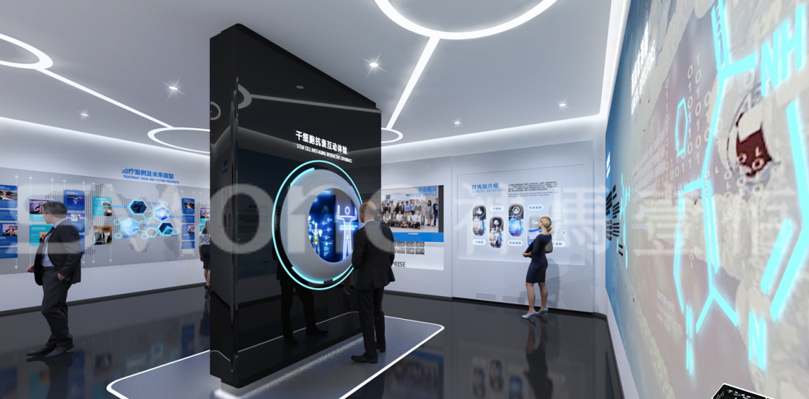 干細(xì)胞機(jī)械互動(dòng)裝置實(shí)時(shí)感應(yīng)監(jiān)測(cè)透明屏人體無(wú)名氏外表發(fā)生變化,相連的打干細(xì)胞裝置從透明屏人體腳底將填充干細(xì)胞,由感應(yīng)裝置接收信息,根據(jù)打氣的多少展示干細(xì)胞的多少和面容的改變。