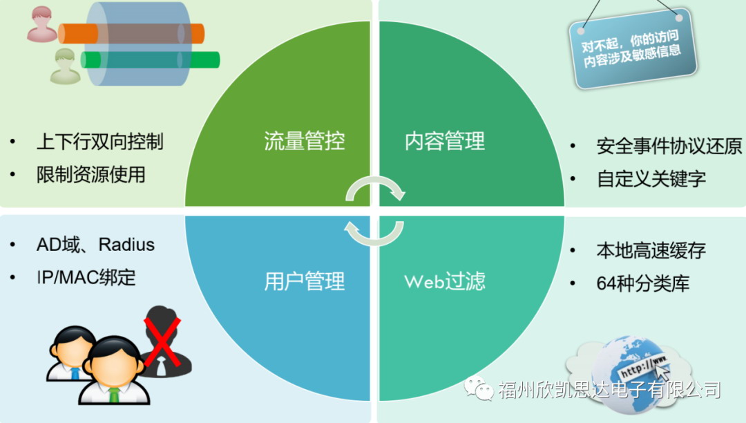 控制每個(gè)上網(wǎng)用戶的流量大小,屏蔽 P2P、在線視頻等消耗網(wǎng)絡(luò)帶寬的應(yīng)用,控制 QQ 等聊天工具的使用,禁止對(duì)色情、暴力、惡意網(wǎng)站的訪問(wèn)。限制文件和非法言論的外傳。