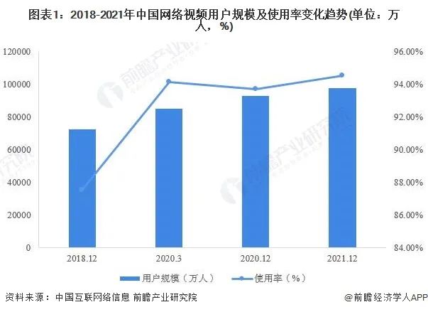 然后是持續(xù)擴大的視聽用戶規(guī)模,為傳統(tǒng)行業(yè)的發(fā)展源源不斷注入新活力。當下視聽設備技術日趨成熟,網(wǎng)絡視聽節(jié)目制作能力和質(zhì)量提升明顯,一批優(yōu)質(zhì)作品憑借獨特的美學價值、文化內(nèi)涵與傳播特點為觀眾帶來豐富的視覺體驗。截至2021年12月,我國網(wǎng)絡視頻(含短視頻)用戶規(guī)模達9.75億,較2020年12 月增長4794萬,占網(wǎng)民整體的94.5%。
