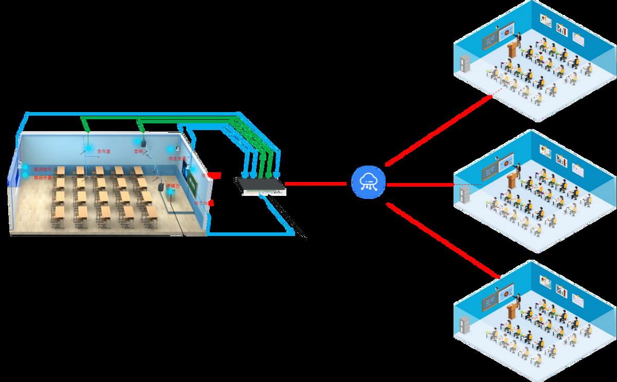 同步課堂,可把公開教室的電腦畫面以及老師講課的聲音轉(zhuǎn)播到學校所有班級,支持雙向視頻語音對講,形成遠程互動教學。