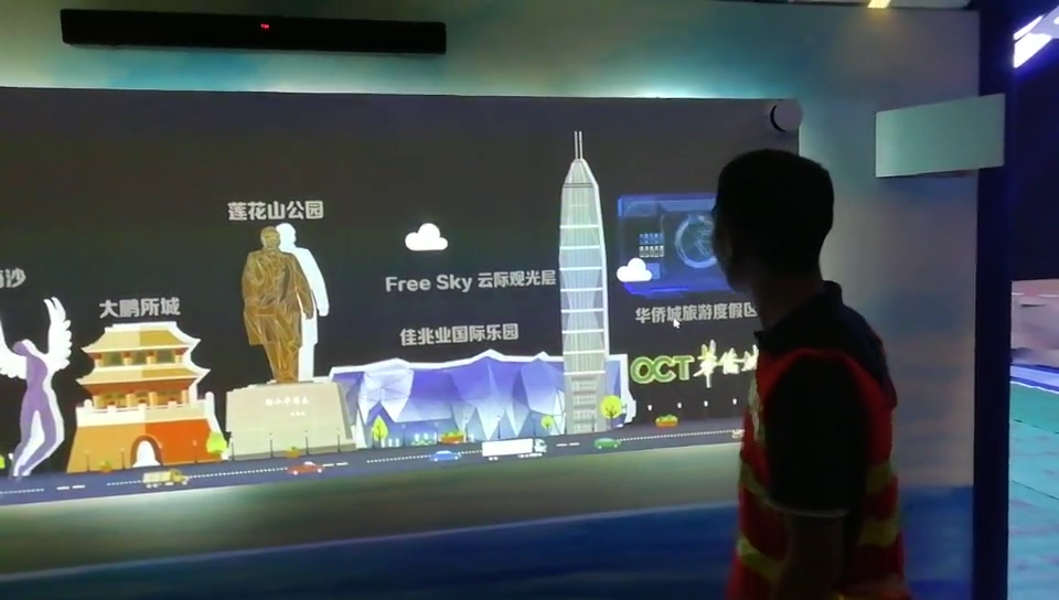 用投影和雷達(dá)把大型的墻面變成超級觸摸屏,用戶不僅可以觀看到高畫質(zhì)投影的圖像,同時(shí)也可用手觸摸墻面,根觸摸屏一樣,可以作為游戲、路標(biāo)指示、詳情介紹等場景使用。