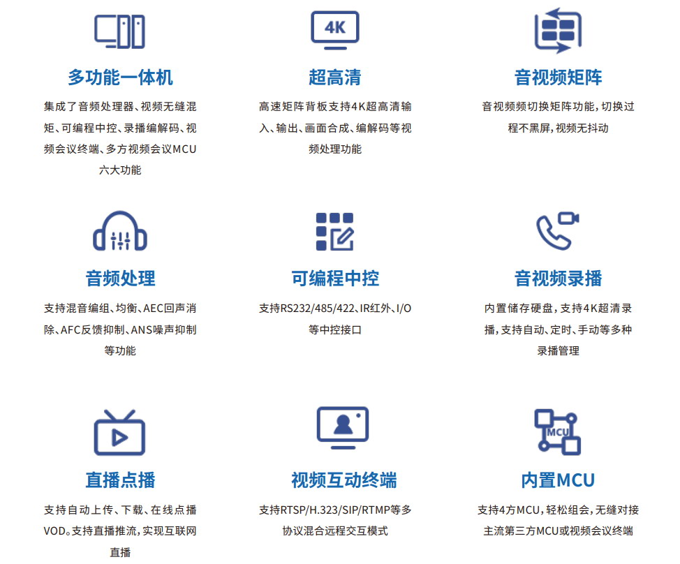 視頻、音頻、會(huì)議、錄播、中控子系統(tǒng)一體化主機(jī)集中控制。