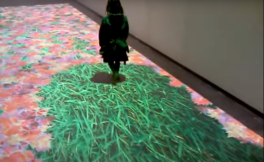 地面互動(dòng)的效果有很多,比如投影的是水面,人踩上去有水紋波、水里有魚,人踩上去的時(shí)候魚兒會(huì)游開、又比如人踩的地方花會(huì)綻放等。
