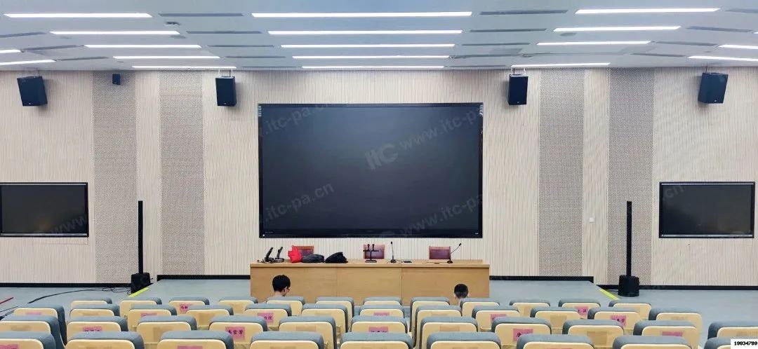 為解決上述問題,itc通過計算報告廳的音響場地系數(shù)進行設(shè)計,將4只350W輔助音箱、2只400W落地組合式音箱合理分布于報告廳場所,降低聲反饋概率,提高傳聲增益,解決嘯叫難題,保證報告廳每個角落的聲場聽覺均勻,具備良好的指向性控制,打造出卓越的擴聲體驗。