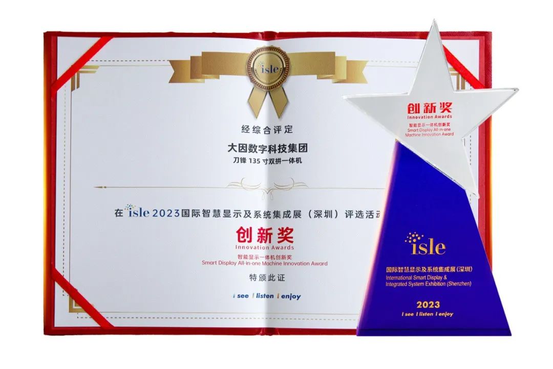 4月7日-4月9日,ISLE國際智慧顯示及系統(tǒng)集成展在深圳國際會展中心隆重舉行,在展會期間舉辦的ISLE 2023優(yōu)秀展示產(chǎn)品評選活動中,DANANCOID 刀鋒135寸雙拼一體機憑借高質(zhì)量的顯示效果和豐富的場景應用方案,榮獲isle國際智慧顯示及系統(tǒng)(深圳)展創(chuàng)新獎。
