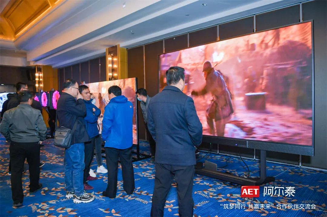 本次交流會現(xiàn)場,AET阿爾泰為到場的伙伴們展示了好萊塢DCI-P3電影級絕美大屏、43/46/55/60吋AT系列HDMI版標(biāo)準(zhǔn)顯示單元、追光系列戶外裸眼3D大屏、NX系列P0.9通用產(chǎn)品、120吋一體機等標(biāo)桿產(chǎn)品,除戶外大屏外,所有展品均加載QCOB工藝。