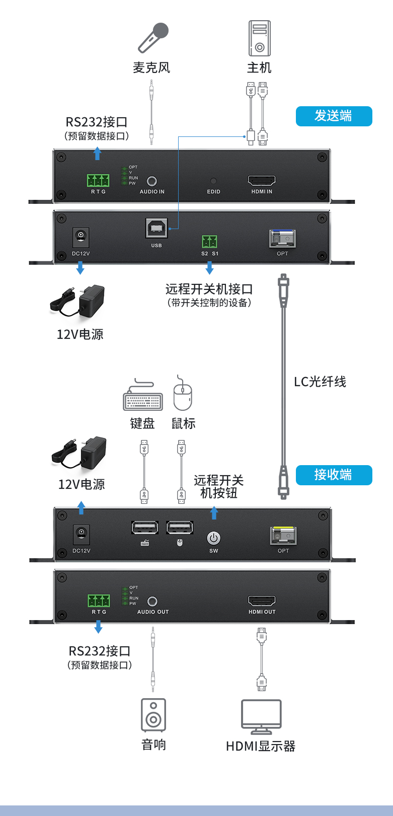 采用3G光模塊高速傳輸,音視頻同步傳輸鍵盤(pán)鼠標(biāo)功能,單纖傳輸0~20KM,性能可靠放心
