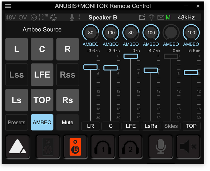 AMBEO 雙聲道空間音頻實時渲染器讓所有觀眾都能領(lǐng)略環(huán)繞聲和沉浸式內(nèi)容的魅力。圖中所示為渲染器界面的原型機(jī),可對更有空間感的雙聲道混音進(jìn)行微調(diào),可通過標(biāo)準(zhǔn)Anubis遠(yuǎn)程控制軟件進(jìn)行控制