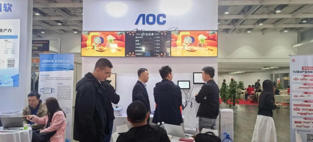 展會現(xiàn)場持續(xù)升溫,AOC展示體驗區(qū)現(xiàn)場氣氛火熱,參展觀眾現(xiàn)場熱情體驗AOC前沿視訊技術(shù)及零售解決方案。其中,43"高清高亮商用數(shù)字標牌新品打造零售多聯(lián)屏解決方案,其具備纖薄微邊框、700nits高亮度屏幕、FHD高清畫質(zhì)、7×24小時不間斷播放等特性,搭載自研CMS信發(fā)系統(tǒng),實現(xiàn)畫面統(tǒng)一管控及實時更新;15.6"觸控標牌新品打造零售自助點餐解決方案,其支持觸控書寫,有助于進行餐品菜單查詢及實時點餐下單;27"商用數(shù)字標牌打造智慧叫號解決方案,實時展示排隊叫號信息,實現(xiàn)等候列表與呼叫信息分屏顯示,便于消費者及時取餐。