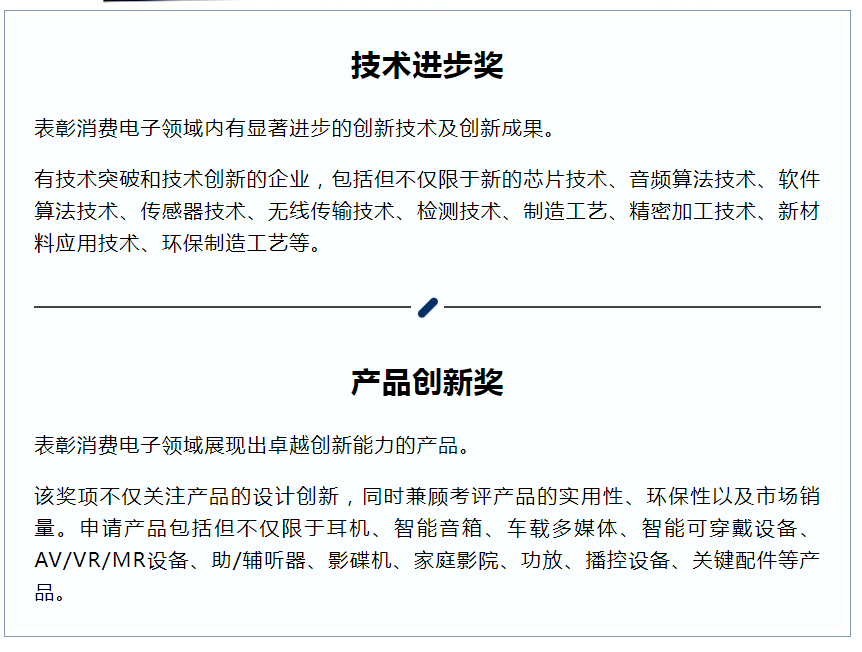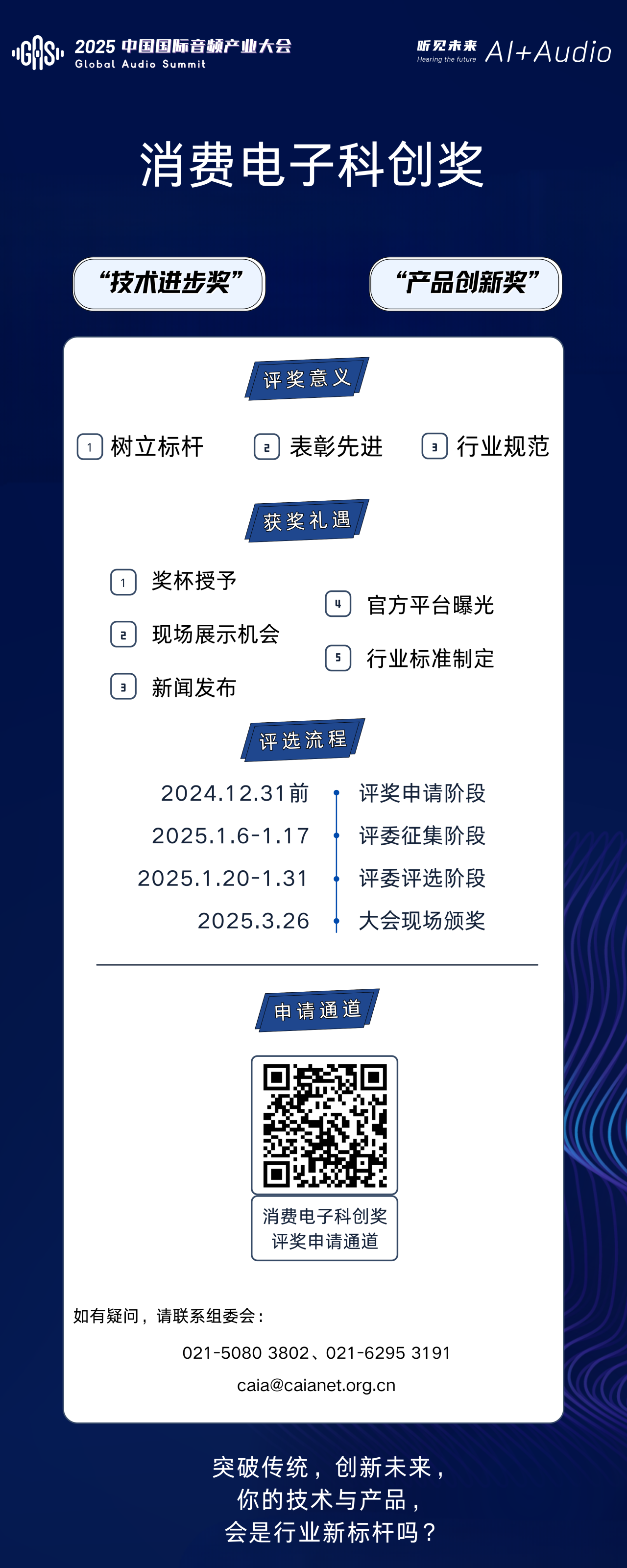 探索科技邊界,引領(lǐng)創(chuàng)新潮流!2025中國(guó)國(guó)際音頻產(chǎn)業(yè)大會(huì)除主旨論壇、專(zhuān)題論壇、快閃演講、展覽展示外,將推出2025年度“GAS消費(fèi)電子科創(chuàng)獎(jiǎng)”,包含“技術(shù)進(jìn)步”獎(jiǎng)及“產(chǎn)品創(chuàng)新”獎(jiǎng)。是一個(gè)旨在推動(dòng)消費(fèi)電子行業(yè)技術(shù)進(jìn)步和產(chǎn)品創(chuàng)新的重要獎(jiǎng)項(xiàng)。