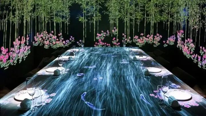 沉浸式投影技術(shù)的出現(xiàn),打造出了科技感十足的沉浸式光影餐廳。