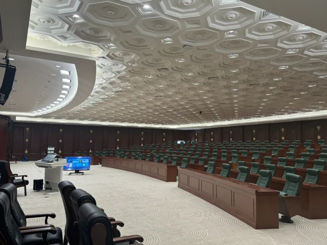 國家行政學院多功能廳長32米,寬24米,層高約3.3米,座位采用階梯式布置,舞臺設置在教室的長邊,舞臺寬約16米,深4米。