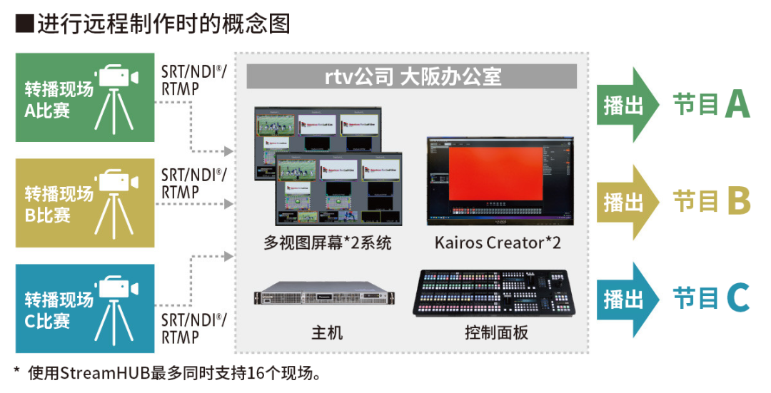 利用IT/IP現(xiàn)場視頻處理平臺KAIROS構(gòu)建全IP遠程中心。統(tǒng)一接收來自各轉(zhuǎn)播現(xiàn)場的影像,實現(xiàn)穩(wěn)定的遠程制作。