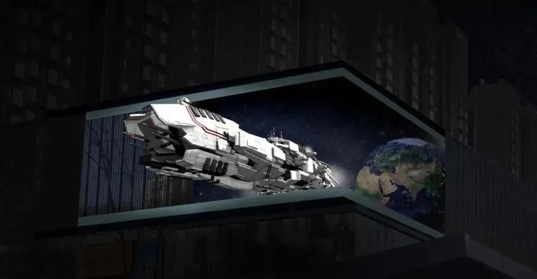 像大眾常見的在高樓上建造的裸眼3D大屏,大多都是由兩個不同角度的畫面組成,顯示屏將畫面折疊90°。
