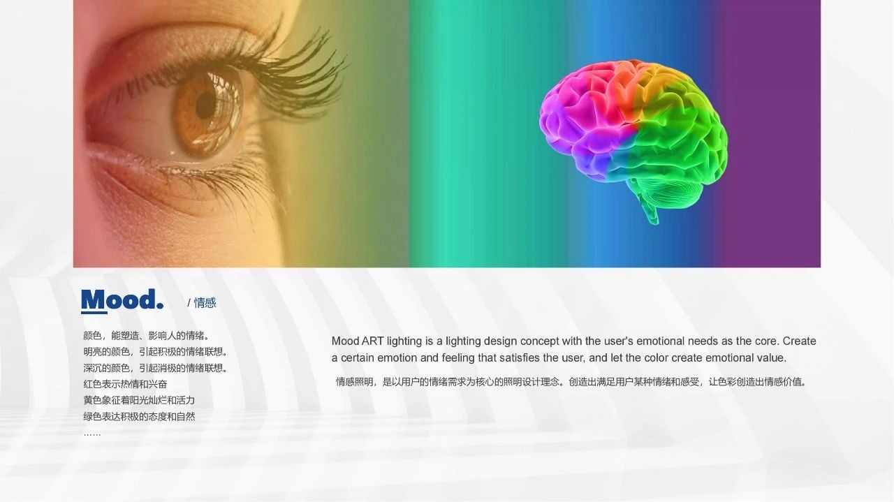 “情感照明”,一種通過AI算法和色彩調(diào)節(jié)為用戶創(chuàng)造獨(dú)特情感體驗(yàn)的照明系統(tǒng)。打破了傳統(tǒng)照明單一功能的局限,將光與情感、氛圍緊密結(jié)合,實(shí)現(xiàn)了功能照明與演繹聯(lián)動(dòng)的完美融合。