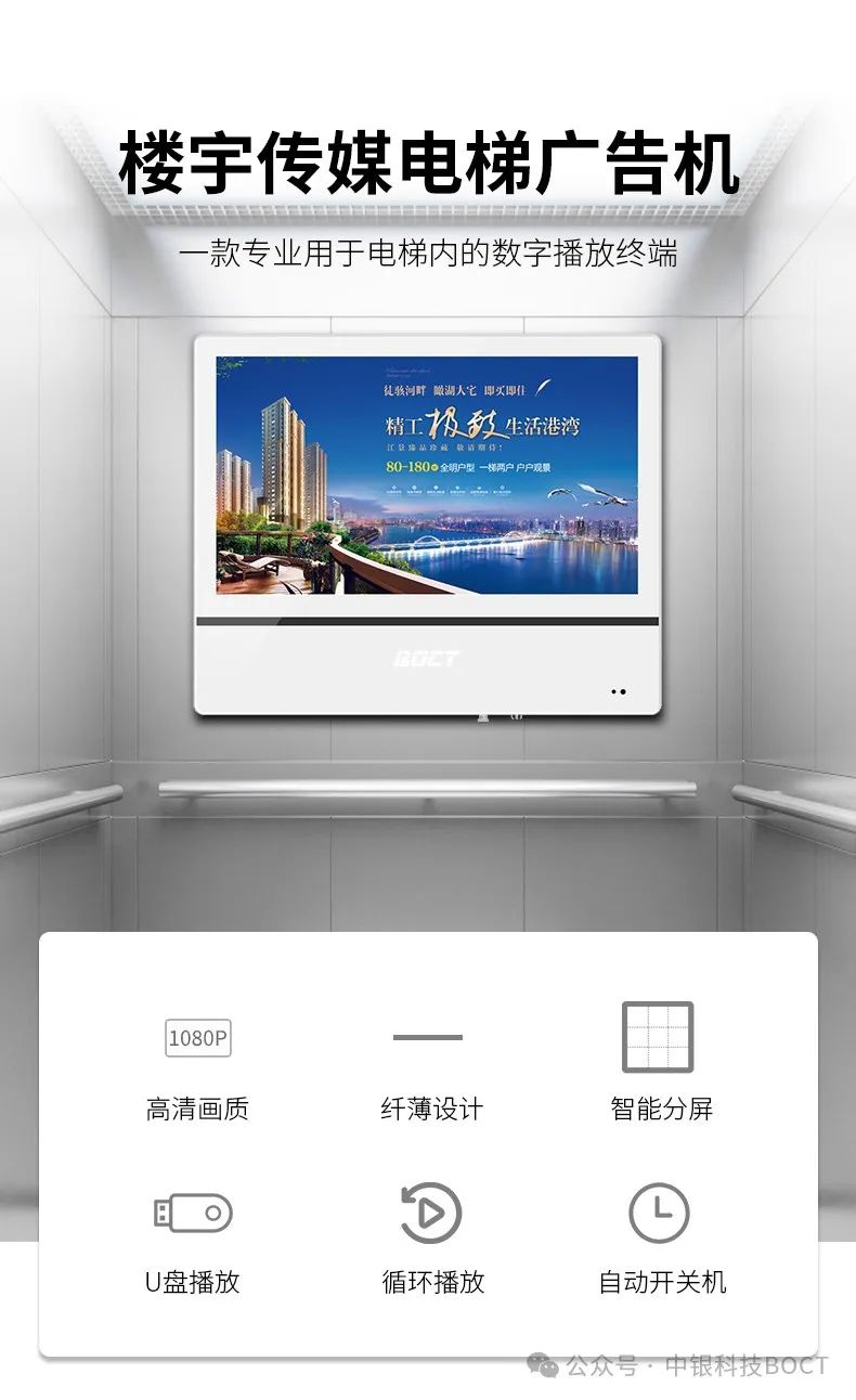 中銀樓宇廣告機(jī)對(duì)目標(biāo)受眾進(jìn)行精準(zhǔn)定位,實(shí)現(xiàn)廣告投放的高效精準(zhǔn)。畢竟電梯時(shí)我們每日出行必乘的載物,無(wú)論是家門(mén)口的電梯,還是公司的電梯。
