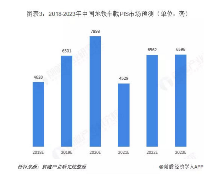 據(jù)“十三五”規(guī)劃綱要的內(nèi)容,預(yù)計2020年城市軌道交通營業(yè)里程將超過6600公里,新建里程達(dá)到3000公里,預(yù)計地鐵里程達(dá)到5318公里,按照我國城市軌道交通車輛保有量密度為11輛/公里來保守估計,“十三五”期間我國城軌建設(shè)帶來的地鐵車輛需求增加3萬輛,年均增加6000輛。而按照一輛車搭配一套車載PIS系統(tǒng)推測,2018-2023年,地鐵PIS系統(tǒng)市場需求每年可保持在4500套以上;到2023年,地鐵PIS系統(tǒng)市場需求將達(dá)到6596套,