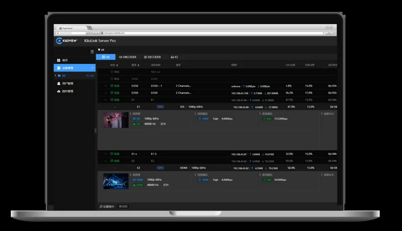 完全免費(fèi)使用的KiloLink Server Pro不僅可以作為推流的載體,更能將設(shè)備集中管理、批量升級(jí)等功能全面整合,F(xiàn)在,您可以通過(guò)WEB端輕松完成無(wú)上限設(shè)備管理、狀態(tài)查看及監(jiān)測(cè)、無(wú)限路數(shù)一鍵推流,使復(fù)雜的流媒體管理工作變得簡(jiǎn)單高效。而在日常的工作流中,也無(wú)需額外購(gòu)買語(yǔ)音通話系統(tǒng)、專用解碼器等設(shè)備。您可通過(guò)KiloLink Server Pro及Kis Pro完成語(yǔ)音通話/指揮系統(tǒng)的搭建,而通過(guò)任意型號(hào)解碼器(如千視D350)即可完成解碼工作。這意味著您可以用最低成本的方式高效完成現(xiàn)有工作流的升級(jí)。
