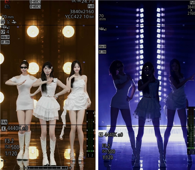 針對時拍傳媒的唱跳團播場景,佳能“佳直播”為其量身定制了三機位娛樂團播解決方案,采用2臺佳能EOS C80搭配RF70-200mm F2.8 L IS USM Z鏡頭,分別承擔(dān)主機位和特寫機位,另用1臺佳能EOS R5 Mark II搭配RF24-70mm F2.8 L鏡頭作為游機位。主機位負(fù)責(zé)拍攝整體舞臺的質(zhì)感和氛圍,特寫機位負(fù)責(zé)捕捉主播細(xì)膩的表情瞬間與動作細(xì)節(jié),游機位則通過多樣化的“花式”運鏡,帶來具有沖擊力的動感臨場視角,有效提升用戶停留時長。