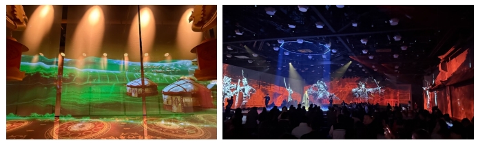 《昭君出塞》紗幕投影(左);三樓劇場四面舞臺上的沉浸式視覺效果(右)。