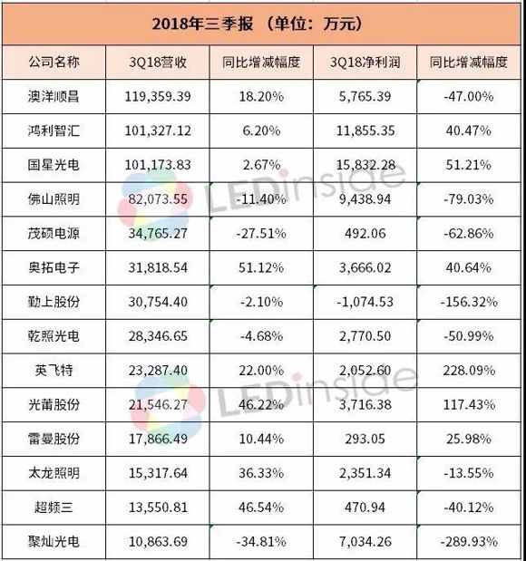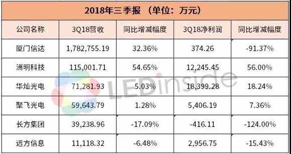 近日,聚飛光電、廈門信達、遠方信息、洲明科技、華燦光電及長方集團相繼公布第三季度報告,其中,聚飛光電、洲明科技和華燦光電實現(xiàn)營收凈利雙增長,其余三家企業(yè)凈利潤同比有不同程度的減少。